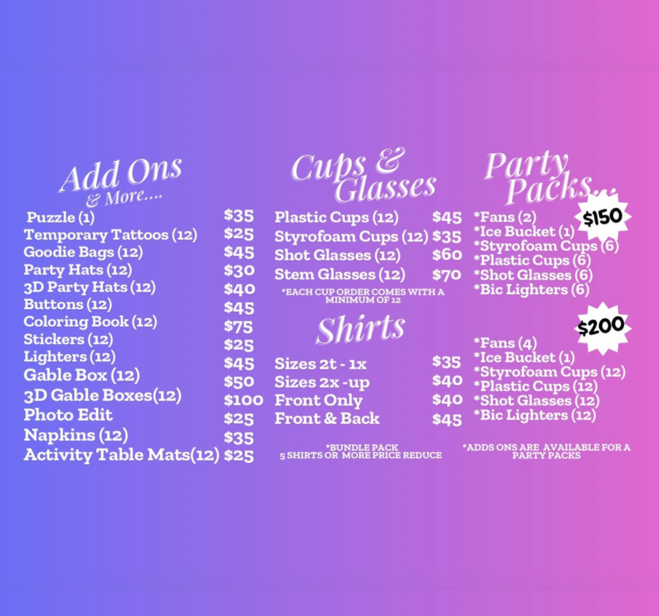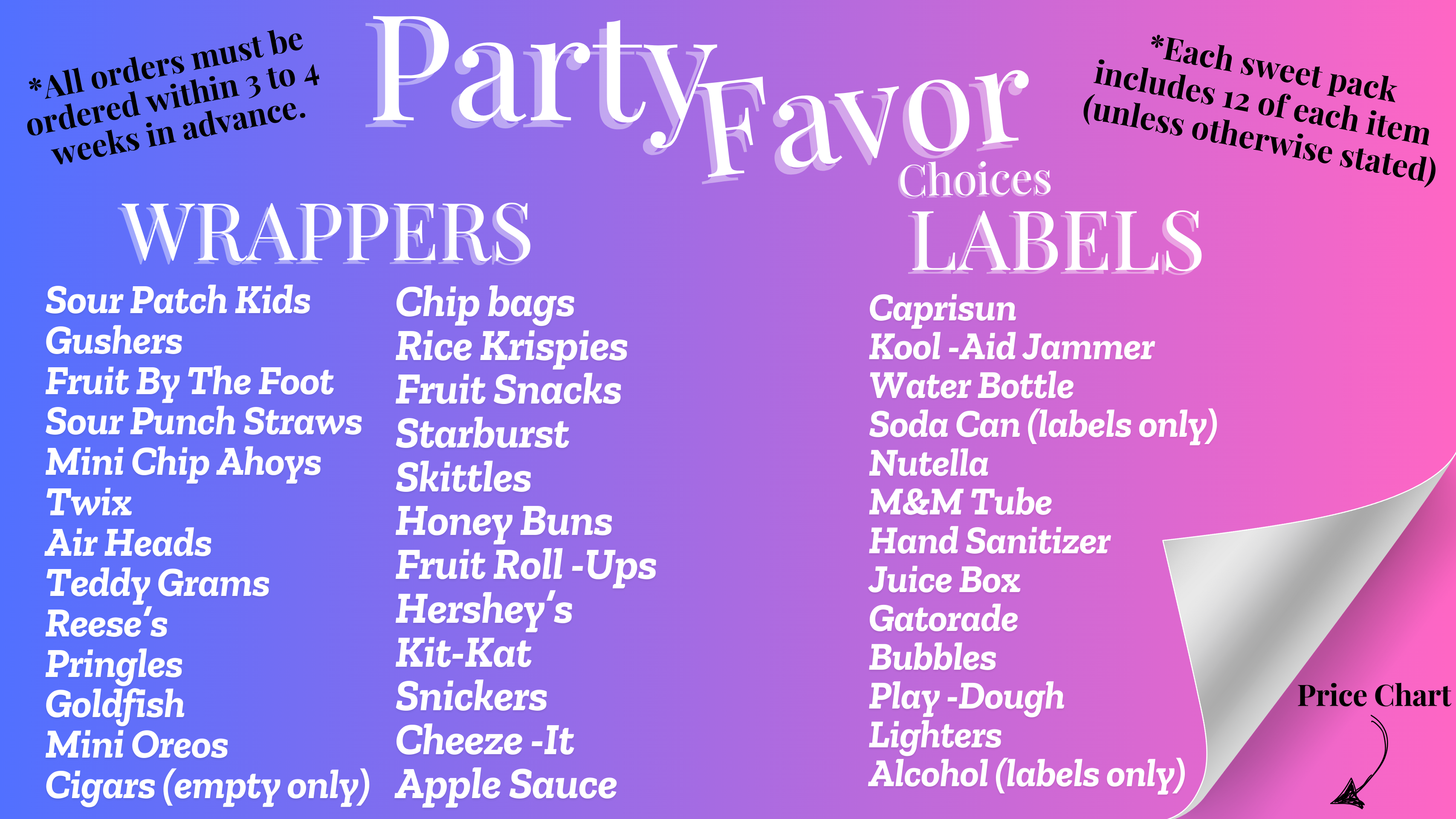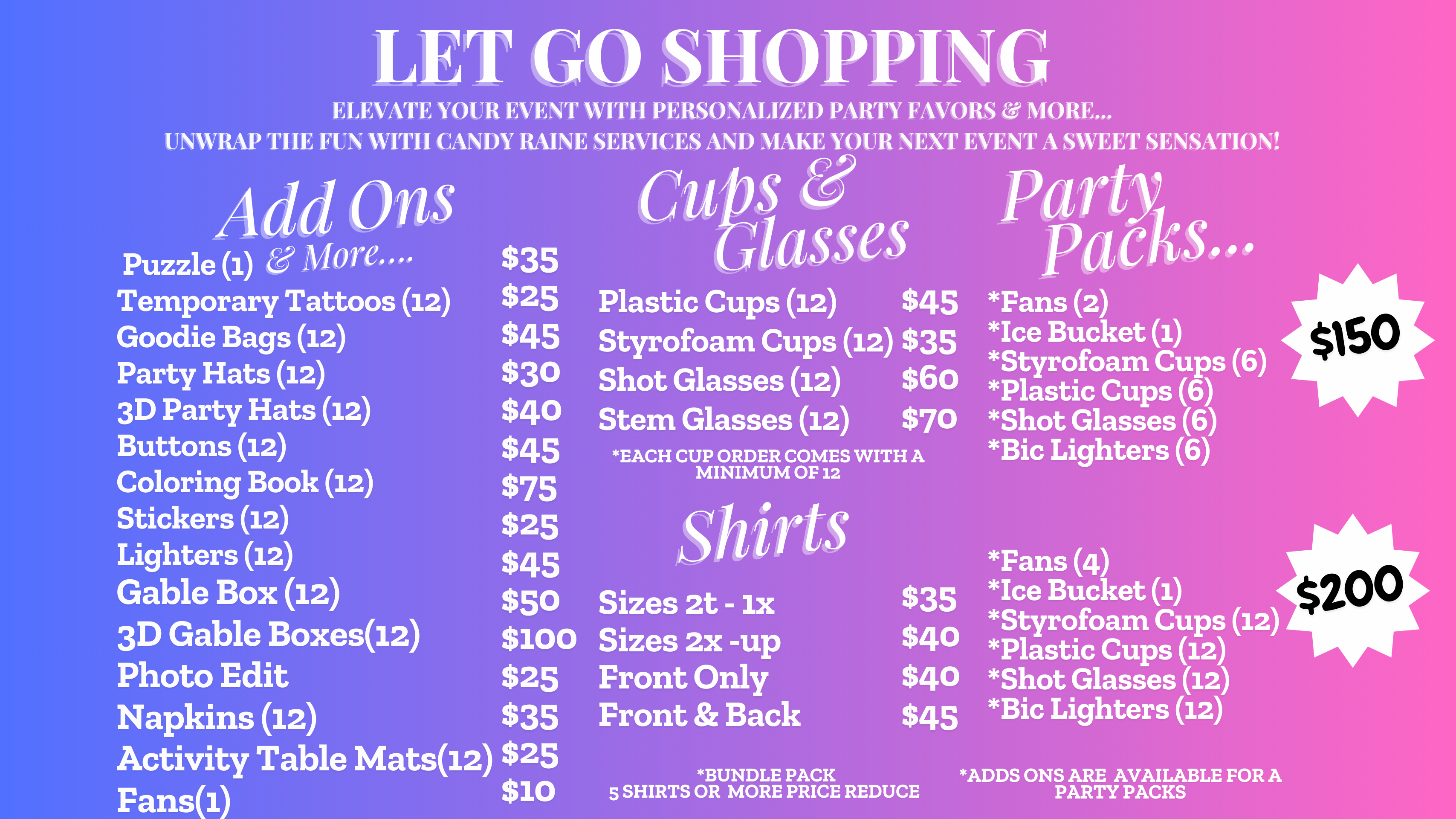 Candy Raine Services, is a company that provides custom party favors and more. Our mission is to bring your party favor vision to life!